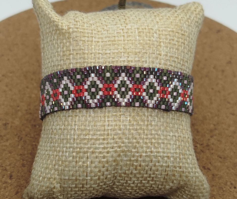 Inspiration. Un ruban de losanges réguliers (“komon”) aux teintes automnales — rouge grenat, vert mousse, prune et éclats ivoire — tissé perle à perle pour un motif fin et graphique.